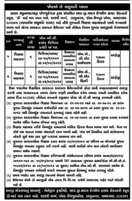 R.G.Yadav English Higher Secondary School (Lagumati School) Bapunagar Ahmedabad Shikshan Sahayak Recruitment 2016 : R.G.Yadav English Higher Secondary School Bapunagar Ahmedabad has published notification of Shikshan Sahayak Posts.for more details are given below.